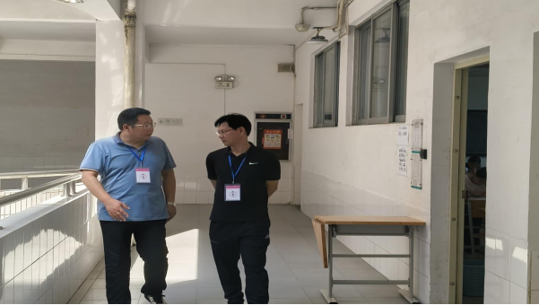 图:保卫部(武装部)陈静浪部长(右)巡查燕岭校区教资考试笔试考场