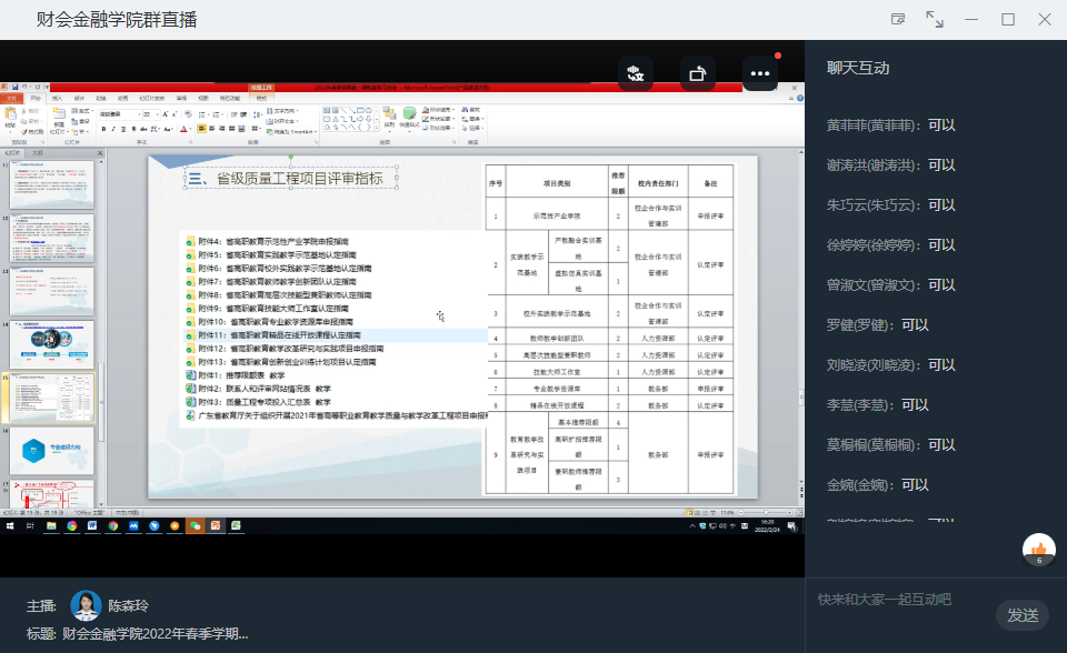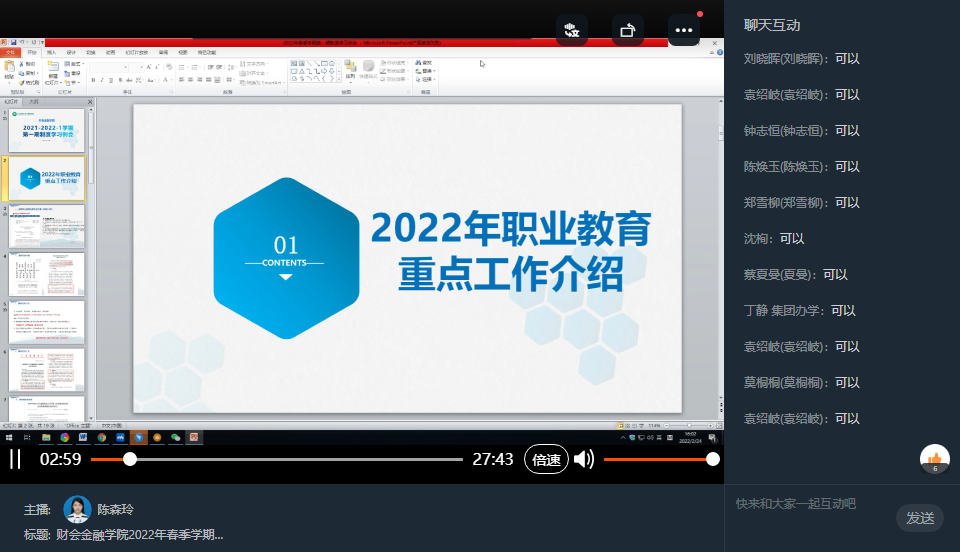 为集中学习2022年职业教育重点工作,学习领会国家文件精神,营造学院制度学习氛围,2月24日下午,财会金融学院在线上召开2021-2022-2学期第一期制度学习例会,由副院长陈森玲带领全体教师进行学习。