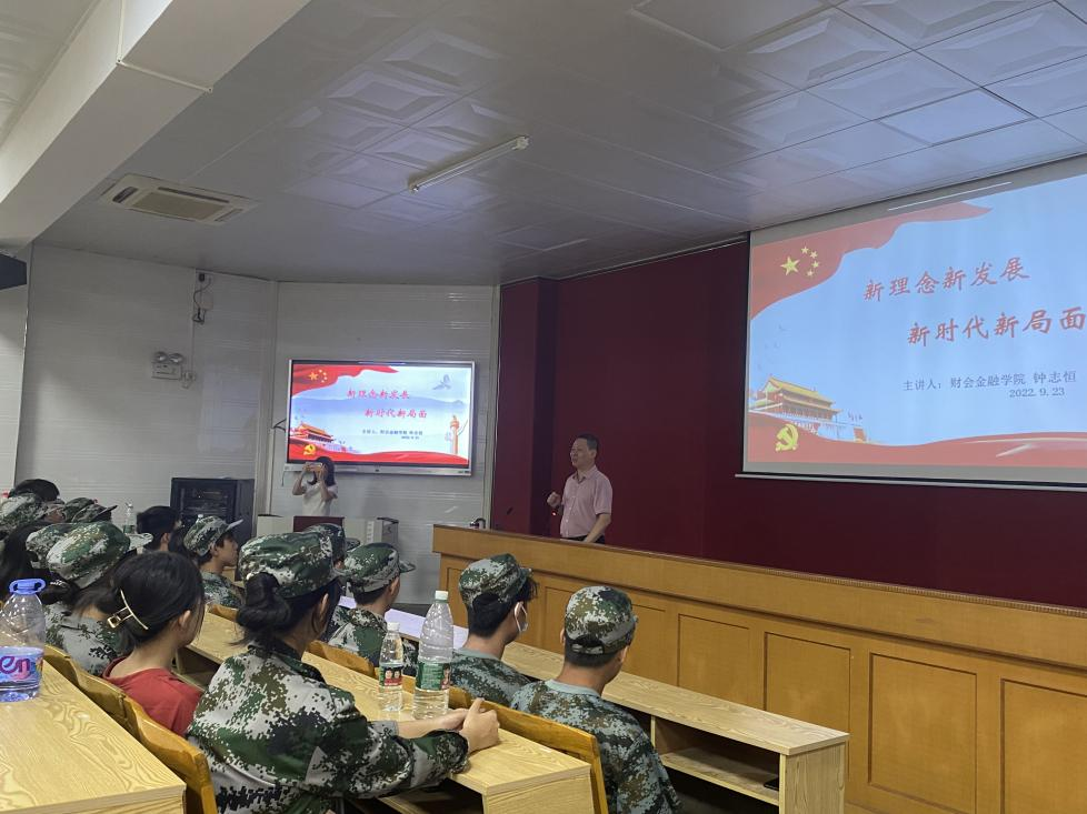 钟志恒以“新理念新发展、新时代新局面”为题,从党的建设、经济发展、着力防范化解重大风险、现代化进程、科技进步、人与自然和谐共生等方面,带领同学们回顾我们党百年奋斗的辉煌历程,学习国家未来发展的新思路和新理念,认识时代发展新趋势和新方向,提振信心,坚定信念,激发起同学们强烈的民族自豪感和文化认同感。课程最后,钟志恒和新生代表亲切交谈,询问了同学们来到学院以后的学习、住宿、军训等各方面情况,并勉励大家做好规划,珍惜青春,苦练本领,努力使自己成为对国家和社会有用的人才。