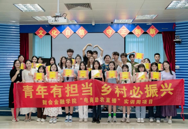 在本次实训项目闭幕仪式上,所有指导教师向参与实训的同学们表示热烈的祝贺,对他们在实训过程中的辛勤付出表示衷心的感谢,总结了同学们在此次实训过程中收获宝贵的经验,助农团队的学生小组也分别派出代表进行发言,分享实训周感想,最后由老师们颁发奖状并进行全体合影留念。本次电商助农直播实训项目在推进乡村振兴战略的实践中取得了阶段性成果,学生将校内所学知识充分用于实践,既有利于提升学生的实践能力,又充分彰显了我院师生在乡村振兴发展中的使命与担当,体现了财会金融学院人才培养的特色。