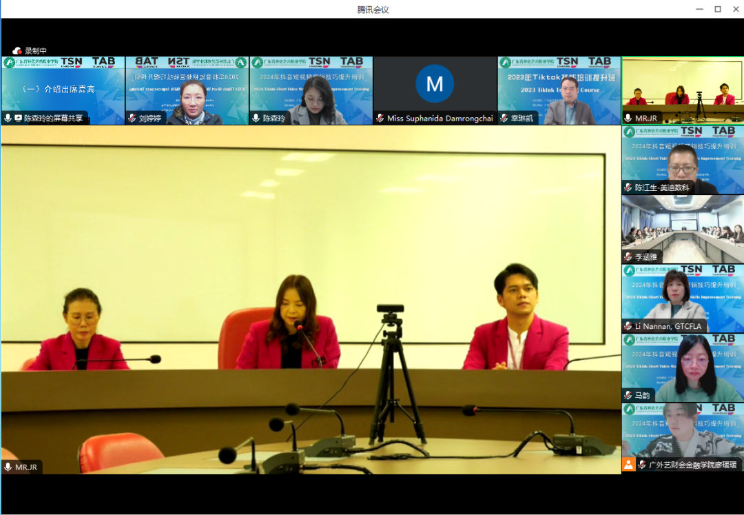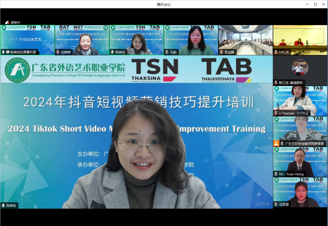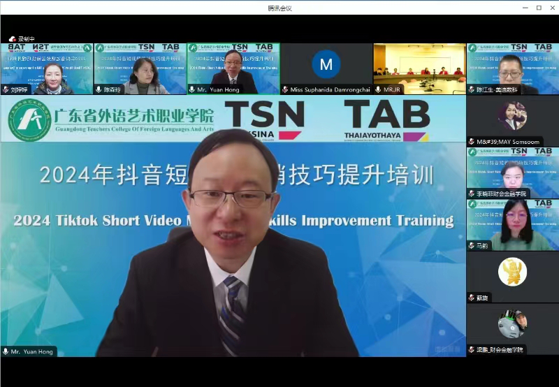 此次培训采取线上直播授课形式,来自泰国大城科技工商管理学院(简称:TAB)和泰国塔克西纳商务管理技术学院(简称:TSN)的71名师生参加。在开班仪式上,来自两所院校的嘉宾,通过视频会议方式,就此次中泰合作的跨国职业技能人才培训及其后续国际化产教融合合作项目等内容,发表了重要讲话。