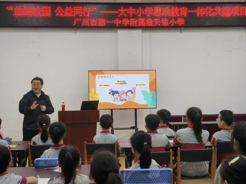 11 月 7 日,继 “益槌校园 公益同行” 项目首场志愿者培训成功举办后,财会金融学院校园公益同行社的志愿者们,携手公益机构,将培训所学转化为实践行动,为广州詹天佑小学带来了一场干货满满的 “小小拍卖家” 知识宣讲课,让大中小学思政教育一体化共建项目落地生根。