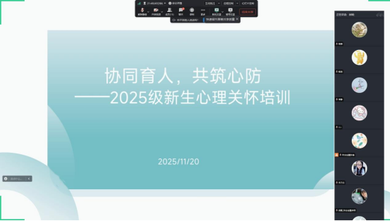 下午,学院通过线上会议形式召开新生班主任专场工作会,聚焦新生适应期心理健康管理与班级建设重点任务。会议简要介绍了新生心理健康筛查的相关情况与工作安排,明确班主任需持续关注新生入学后的心理动态,及时识别并协助解决学生在学习、生活、人际交往中出现的适应问题。