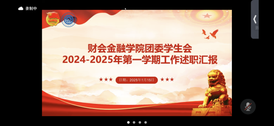为全面复盘与梳理团学工作,切实提升团学组织的工作能力与服务水平,1月15日,财会金融学院团委学生会举办了2024—2025年第一学期工作述职汇报线上会议。此次会议旨在全面总结过去一学期的工作成果,明确未来工作方向,加强学院学生组织的凝聚力与工作效率。本次会议由主席团成员钟雾玲同学主持,学院团委书记招晓兰、学生会指导老师刘家豪以及全体团学干部参加。