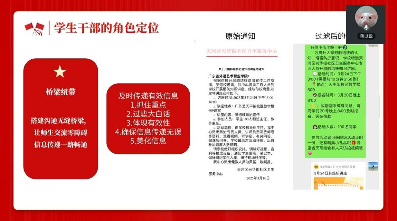 在团课开篇,学生干部蒋以盈深入剖析了学生干部的角色定位。她指出,学生干部身兼模范带头、桥梁纽带、组织凝聚三重关键角色。在模范带头方面,需以身作则,积极参与志愿服务,努力学习专业知识,为同学们树立榜样。在桥梁纽带作用上,学生干部要搭建师生沟通的桥梁,及时、准确地传递信息,如在肺结核防治知识讲座通知的处理中,将原始繁杂的信息提炼转化为简洁明了的通知,保障信息传递的有效性。在组织凝聚方面,可以通过举办“能量传递”“情绪雕塑”等趣味活动,增强同学间的默契与信任,营造团结奋进的集体氛围。