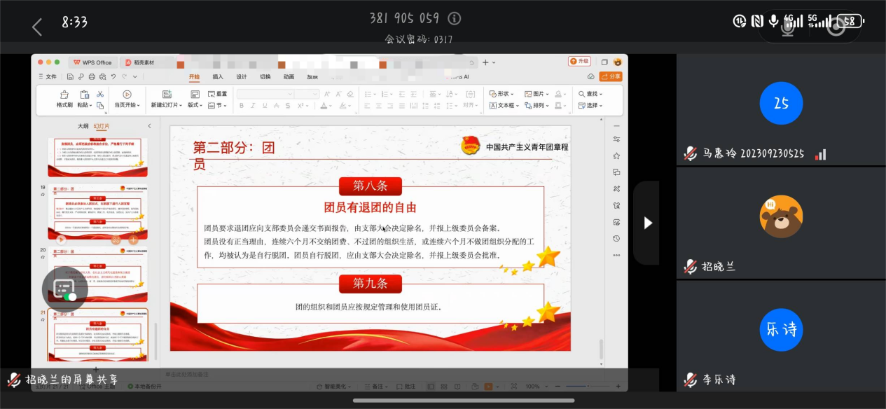在讲解团员权利与义务环节,招老师巧妙结合诸多实际案例,让原本抽象的条文变得生动可感。她以身边优秀团员的事迹为例,鼓励同学们努力学习科学文化知识,提升自我素养;积极投身社会实践,在实践中锻炼能力、增长见识,时刻在学习和生活中发挥模范带头作用。