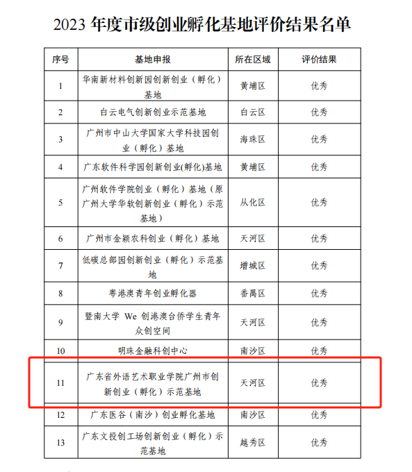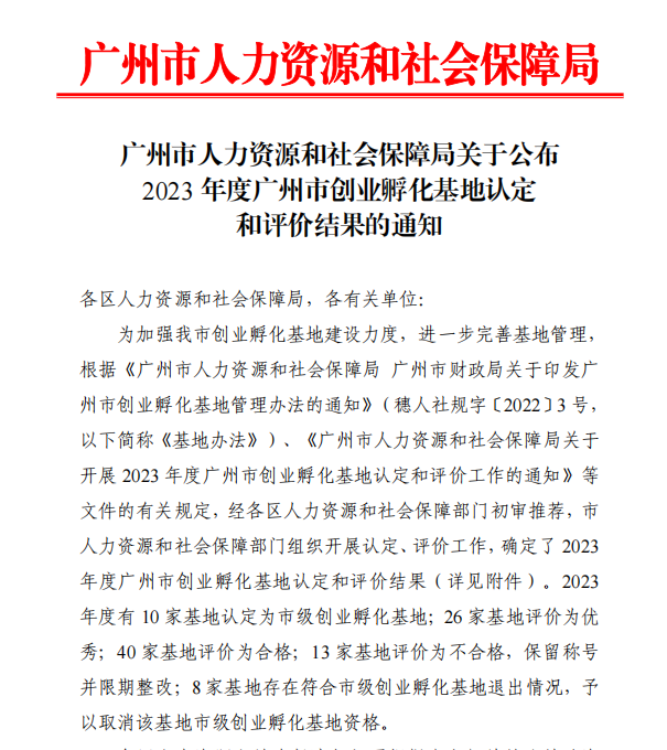 图:学校在2023年度广州市创业孵化基地认定优秀等级