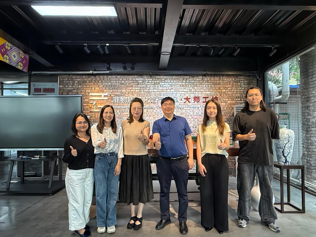 广东技术师范大学非物质文化遗产传承大师工坊暨美育名师工作室主任王羊羊陪同参观大师工坊,详细介绍工坊内现有的刺绣、蜡染、皮雕、掐丝珐琅等非遗手工艺情况。随后,双方就“非遗传承+创新创业教育”展开了深度讨论,并初步达成合作意向。