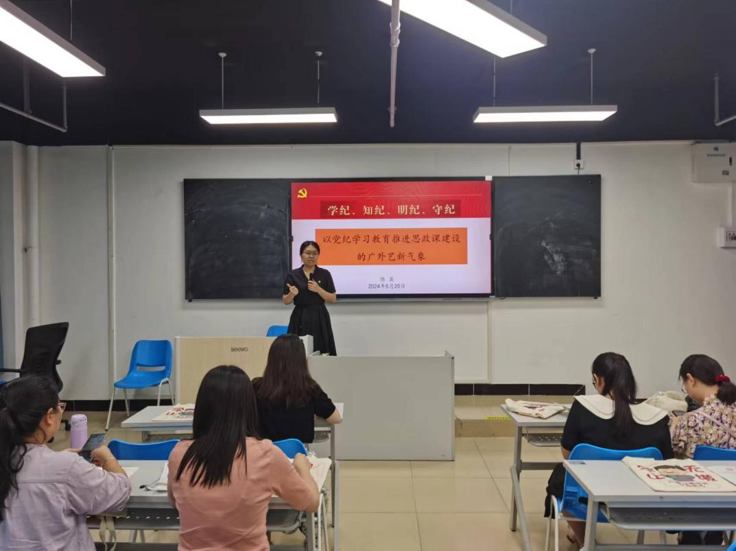 随后,陈英以《以党纪学习教育推进思政课建设的广外艺新气象》为主题,讲了一堂深刻而生动的专题党课。她主要从四个方面开展授课:一是对开展党纪学习教育重大意义的认识,二是对党纪学习教育目标任务的认识,三是关于学习《中国共产党纪律处分条例》的认识,四是推进思政课建设新气象的思考。陈英强调,作为一名思政课教师,必须把严明的政治纪律和政治规矩挺在前,敢于担当、积极作为,全身心投入到推进思政课建设的行动当中,奋力开创新时代思政教育新局面。