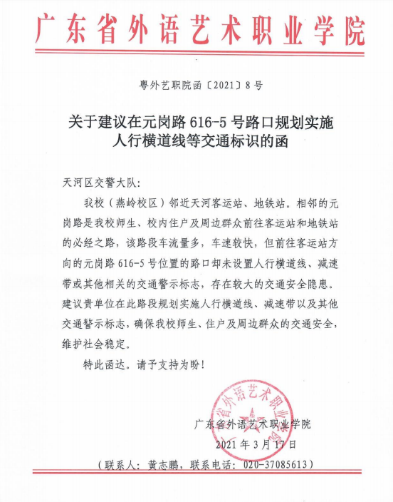 天河区交警大队高度重视学校提议,多次勘察现场,现该路段已完成相应交通标志的规划设置,并为所有路过行人和群众保驾护航。