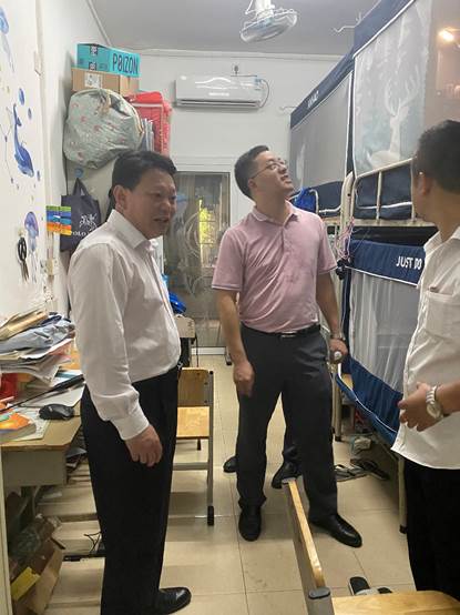 郝勇一行实地走访了燕岭校区基础教育学院、学前教育学院和公共管理学院学生宿舍,每走访一个学生宿舍,郝勇都对宿舍环境卫生、用电安全、消防设施等后勤保障设备逐一检查,耐心询问学生对维修情况的评价,并现场与各职能负责人详细交谈,深入了解情况,对后续的工作任务给予了明确建议,进行了具体指导和布置。
