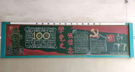 基础教育学院结合党史学习的教育,开展了首届“班级展活力,黑板传知识”黑板报评选活动。学生手执画笔,充分利用黑板报这块阵地,用心构思,将所学、所思、所感、所悟汇聚于黑板报作品中,勾勒出了一幅幅主题突出、构思巧妙、设计独特、风采各异的主题黑板报,生动鲜活的展示了党史文化。