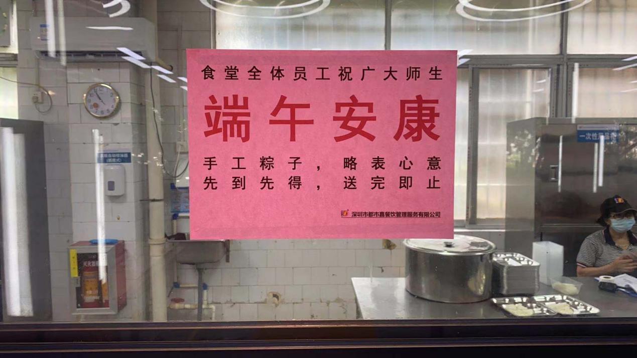 今年的端午意义特殊,面对广州本土的第二次疫情,学校严格管控校园,学生响应号召不聚集、少流动,安心在校园里度过一个难忘的节日。上午10点多,两校区食堂大众餐厅的工作人员早早地便将热气腾腾的粽子摆在了窗口处,供同学们领取。前来就餐的学生手拿着粽子,脸上洋溢着灿烂的笑容,感受着学校的关爱,感受着节日的温情。学校食堂还特意为奋战在抗疫一线的门卫保安送上热气腾腾的粽子和豆浆。
