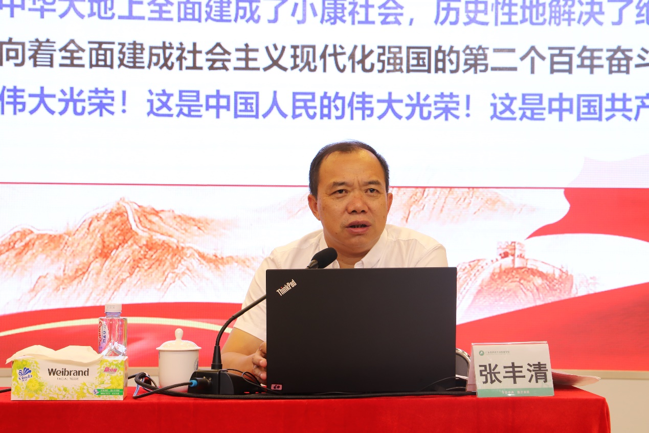 会议邀请了省委教育工委宣讲团成员、华南农业大学马克思主义学院教授张丰清同志作专题辅导报告。张教授的报告以“奋斗百年路 启航新征程”为主题,从回顾中国共产党百年奋斗历程的伟大成就,伟大建党精神与党的精神谱系,以史为鉴、开创未来的九个“必须”,寄语广大青年、号召全体中国共产党员等四个方面,对习近平总书记在庆祝中国共产党成立一百周年大会上的讲话精神做了全面深入的解读。张教授以丰富的实践经验,旁征博引,密切结合高校思想政治理论课改革的要求,深切回顾了中国共产党历经百年来团结带领人民为实现中华民族伟大复兴创造的伟大历史成就,生动描述了我党历经百年奋斗历程形成的伟大建党精神,阐述了以史为鉴、开创未来九个“必须”的丰富内涵,寄语全体党员牢记初心使命,坚定理想信念,践行党的宗旨。讲座生动活泼,气氛热烈。