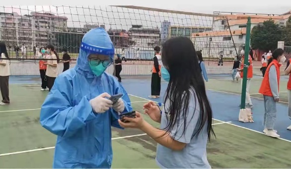 经过岗前培训后,几名我院志愿者穿好防护服,提前到达核酸检测场地,承担核酸检测现场扫码录入工作。志愿者的加入,使学校核酸检测工作速度明显加快,也方便了医护人员直接操作进行样本采集。