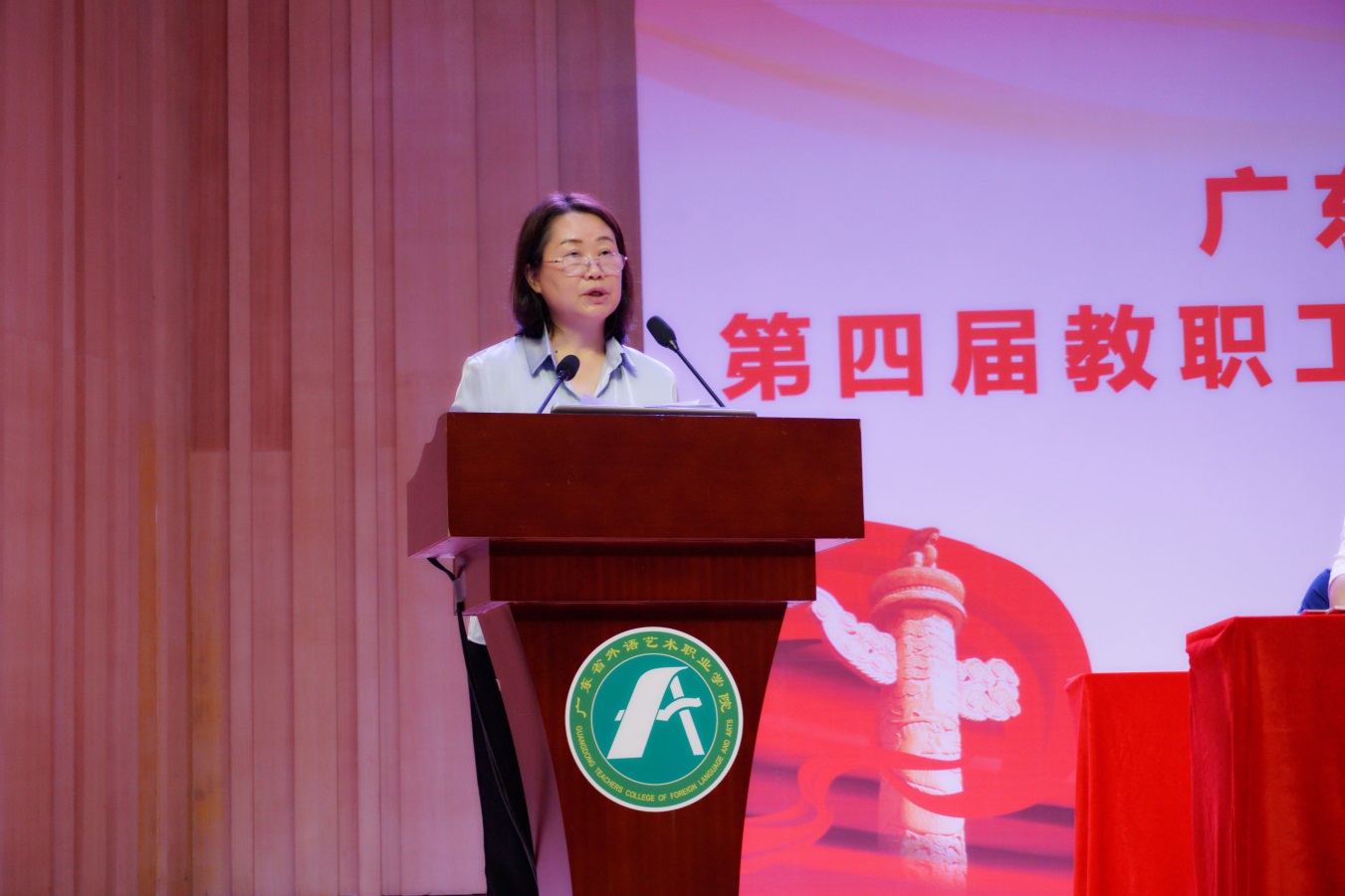 党委书记卢羡文作题为《统一认识激发斗志齐心协力为建设省域高水平高职院校而努力奋斗》总结讲话。她指出这次大会是我校在集团办学四校整合以来召开的第一次教职工代表大会,是一次承前启后、继往开来、凝心聚力、推动新的广外艺奋发进取的大会,在广外艺的发展史上具有重要的里程碑意义。开好这次大会,对于全校上下进一步凝聚共识、统一思想,认清形势、找准定位,激发斗志、奋勇前行,推进学校高质量内涵式发展具有十分重要的意义。大会筹备时间紧、任务重、议程多,代表们重点围绕学校发展规划的落实推进、集团办学深度融合等事关学校事业发展的重大问题,以及教职工普遍关心的热点问题,积极建言献策,为推进学校“十四五”事业发展规划目标的实施、加快高水平校建设贡献了智慧,发挥了积极的促进作用。她结合新修订的《职业教育法》正式施行对社会、职业教育带来的巨大影响,在广外艺新的发展阶段提出三点希望:一要解放思想,以新发展理念促进学校事业改革发展。二要笃定实干,以担当与作为促进学校办学提质增效。三要精诚融合,以事业大发展促进发展成果共建共享。最后,她号召各位代表同心同德、真抓实干、勇毅前行,为推动学校事业发展新跨越,开创高水平高等职业学院建设新局面的目标而努力奋斗,以优异成绩向党的二十大献礼!