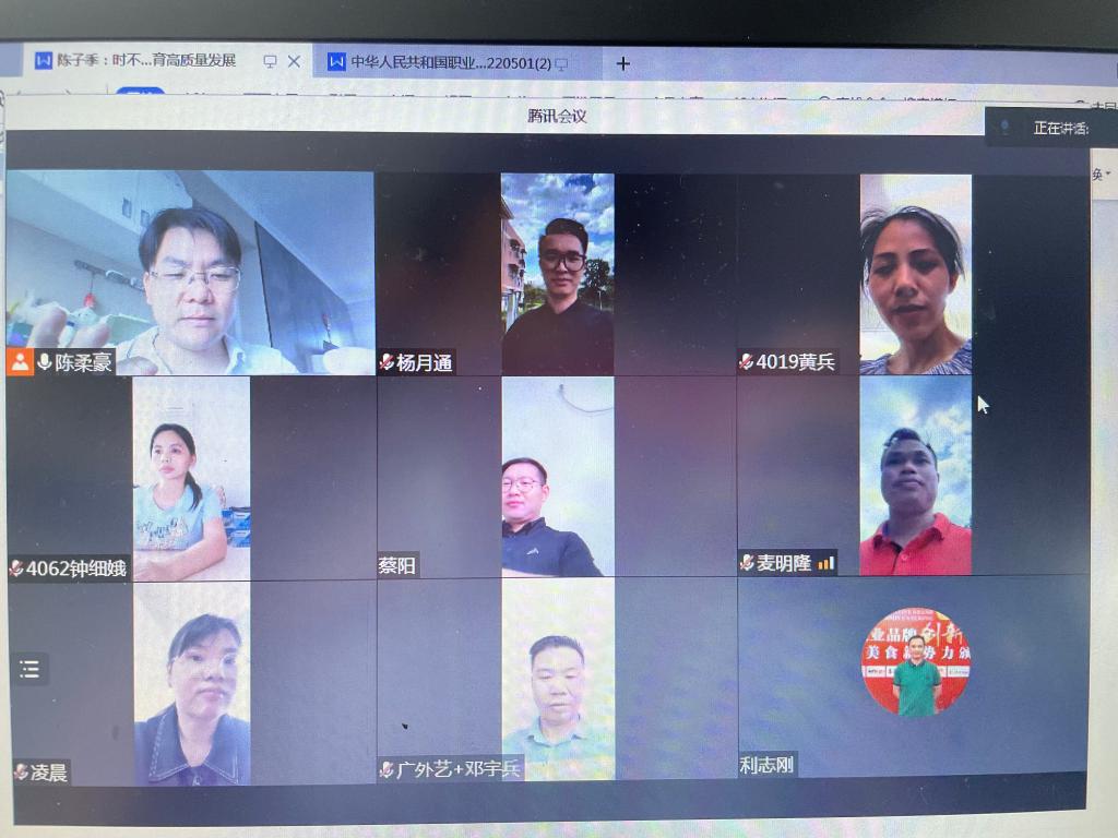 接着,与会老师共同学习了《中华人民共和国职业教育法》、《教育部:党的十八大以来职业教育改革发展成效(节选)》等相关文件希望大家要不断深入学习、深刻领会、准确把握新职业教育法的精神,更要以时不我待的紧迫感、舍我其谁的使命感、革故鼎新的勇气、坚韧不拔的定力,真抓实干、奋勇向前,在贯彻落实新《职业教育法》中肩负起时代赋予的重任,奋力推进学院的职业教育高质量发展,把握好职业教育春天的机遇,努力在实现学院职业教育的高水平发展中更上一层楼。