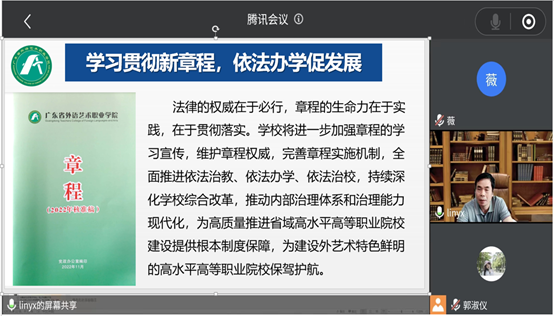 学习会上,林裕旭从学校新章程的修订背景、修订原则和依据、修订的具体情况、组织实施的重要意义等方面进行领学,向与会教职工作了较为全面的解读。他强调,章程的生命力在于实践和贯彻落实,全体师生应主动学习章程、熟悉章程、尊重章程、执行章程,深入领会和把握新章程的主要内容和精神实质,进一步增强依法治校、依章办事的自觉性和主动性。