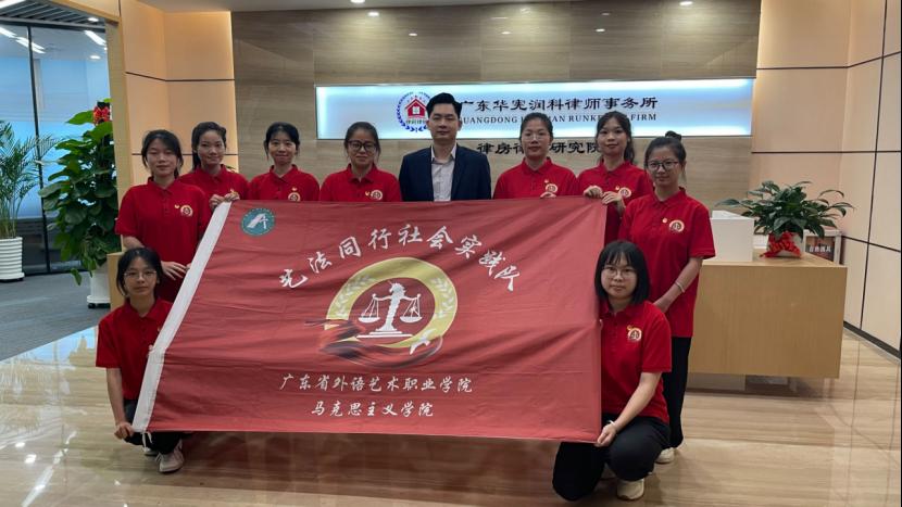 2023年7月3日,金鼎娱乐最新官方网址李丹丽老师带领马克思主义学院艺法同行社会实践队的队员们,来到广东华宪润科律师事务所(以下简称“律所”)参观研学。