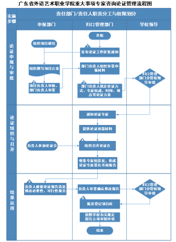 “申报表”通过审核并确定属于学校重大决策的事项后,由归口管理部门组织拟定专家咨询论证工作方案,包括咨询论证方式、时间、地点、专家名单等,经归口管理部门分管校领导审批后组织实施。