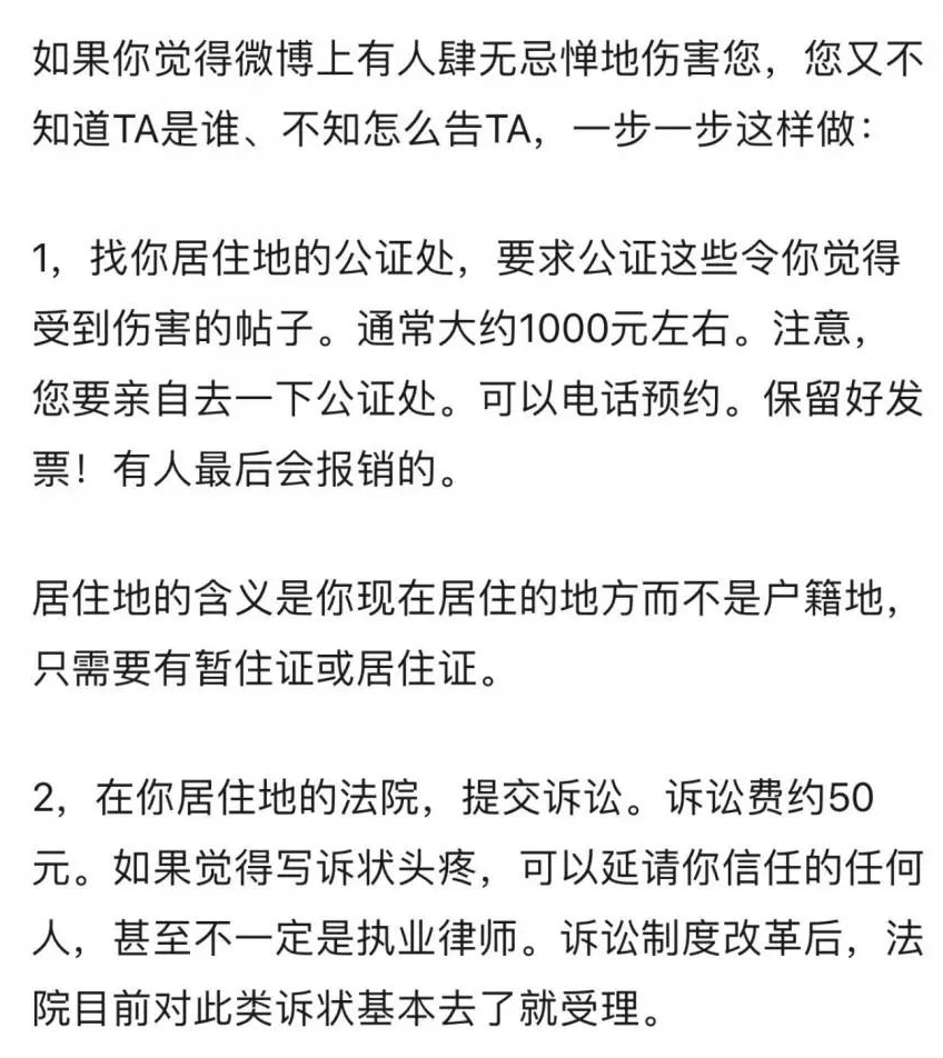 这篇网帖指出的六大步骤,分别是:第一,寻找公证处,对网暴的帖子进行公证(固定证据);第二,找律师,向居住地法院起诉;第三,起诉网络社交平台所属公司,要求提供侵害人的资料。在得到资料后选择和解;第四,收集对方提供的资料;第五,撤销对社交平台的诉状,状告真正的侵害人;第六,胜诉后申请强制执行,以及如何提出具体的赔礼道歉的方式等等。