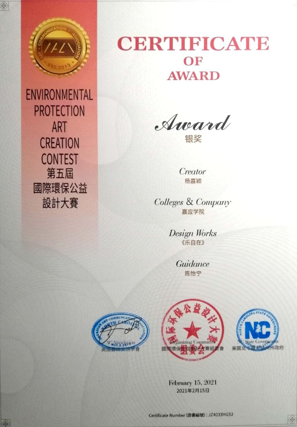 图:杨嘉颖获奖证书