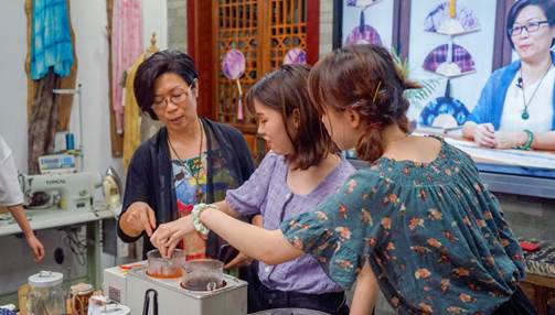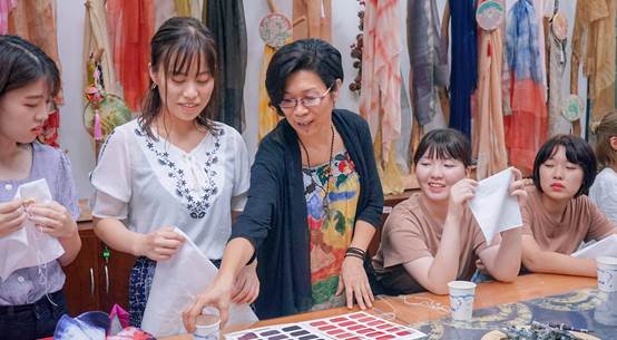 9月的广州,天气依然炎热,但踏入梦幻多彩的艺术空间的一瞬间,一股凉爽的清风扑面而来。工作坊内两侧摆放着由尹教授和她的学生们亲手用植物染或矿物染工艺手法制作的丝巾、扇子、手帕及旗袍等作品。留学生们为坊内错落有致的一件件艺术作品感到震撼的同时,又忍不住为这些作品中隐藏的精致独特的“匠心”发出赞叹。