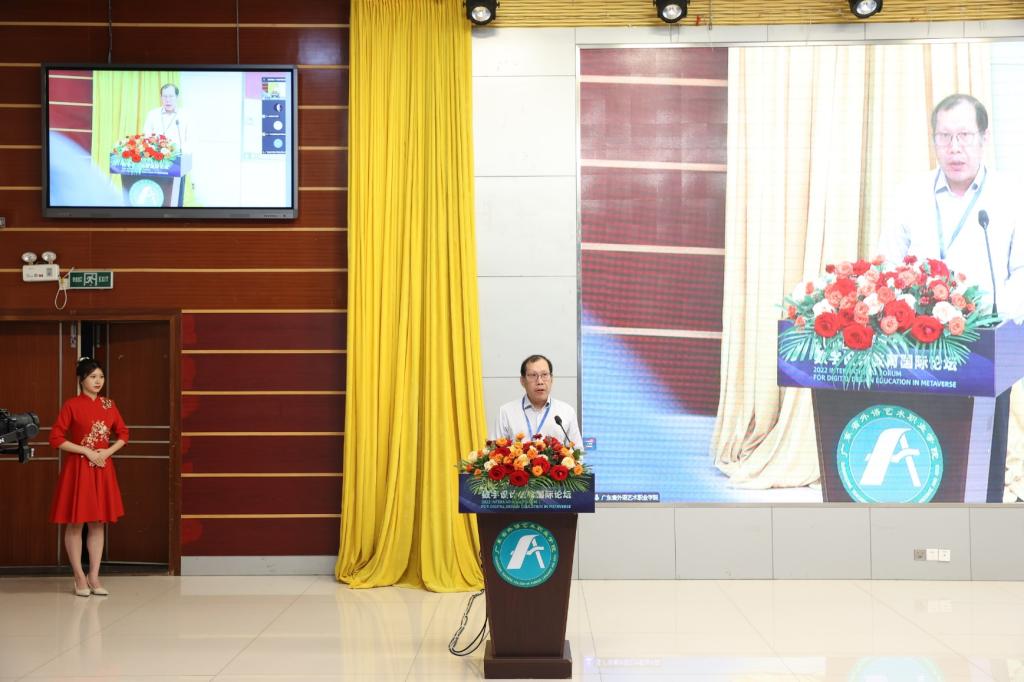我校校长曾用强教授在开幕式上致辞。他表示,未来十年,元宇宙推崇的XR交互式设计将会蓬勃发展,在元宇宙大背景下,艺术设计类专业将面临机遇和挑战,学校要主动对接元宇宙发展赛道,进行新一轮“艺术+科技”的人才培养改革,举办此次论坛恰逢其时。希望通过本次论坛,充分汲取国内外专家学者的智慧与力量,从专业建设角度进一步探索“艺术+科技”人才培养模式的改革创新,助推粤港澳大湾区数字创意产业与职业教育的国际化融合发展,促进广东省数字创意设计人才培养改革和国际影响力的提升。