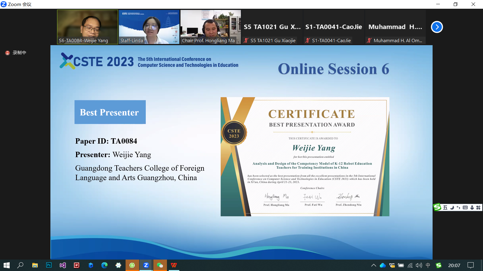 4月20日至23日,第五届计算机科学与技术在教育中的应用国际会议CSTE2023(The 5th International Conference on Computer Science and Technologies in Education)在陕西师范大学举办。我校信息技术学院现代教育技术专业带头人杨伟杰副教授在大会上以研究论文“Analysis and Design of the Competency Model of K-12 Robot Education Teachers for Training Institutions in China”作学术报告,经组委会评选,从54场线上报告中脱颖而出,荣获本次会议的Best Presentation Award(最优秀大会报告奖)。