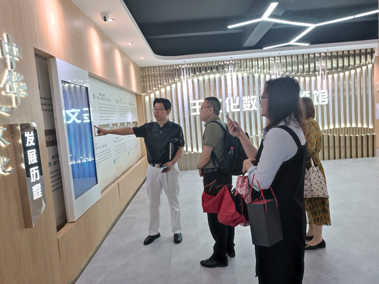 随后,来宾参观了“玉文化数字展览馆”,艺术设计学院院长王大勇为来宾介绍了展馆特色。通过展馆参观,来宾看到了精美玉雕作品、雕刻技艺用虚拟数字化完美展示,及传统技艺与现代数字技术的高度融合,对学校以“艺术+科技”培养具有数字创意能力人才的理念有了更深刻的认识。