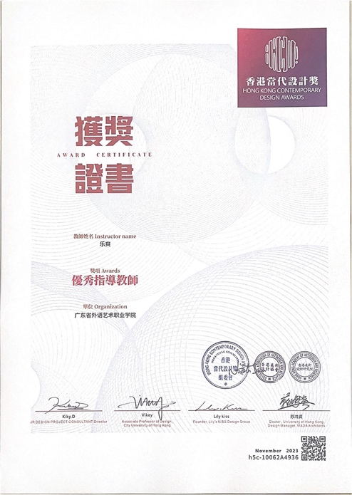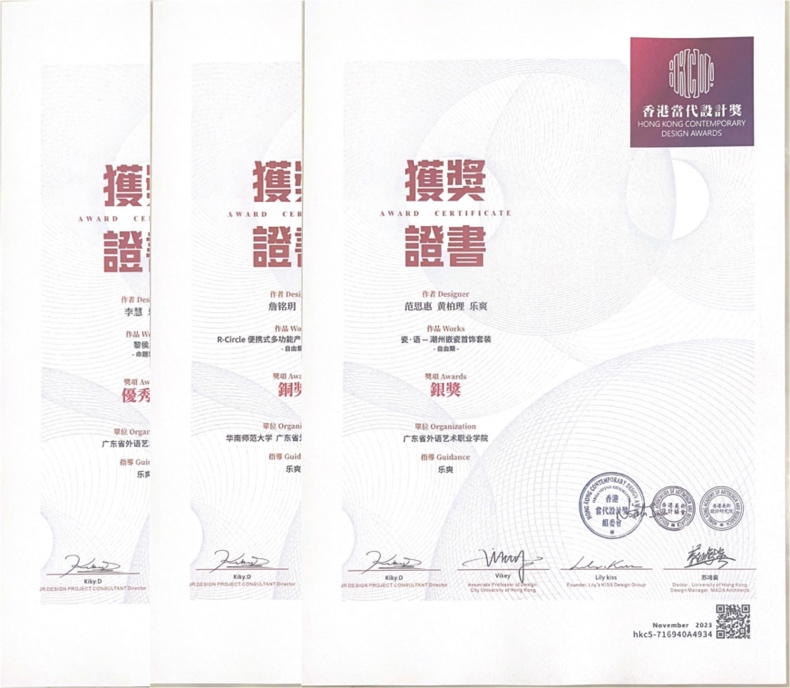 据悉,今年2月,乐爽老师的个人作品《浮·游》在第四届香港当代设计奖中荣获铜奖。5月,在第五届香港大学生当代设计奖中,乐爽老师指导学生荣获1个银奖,并荣获优秀指导教师奖。