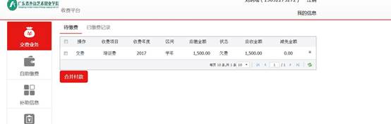 4.登录收费系统。将会看到个人名字的缴费信息,勾选交费,点击合并付款,选择收费方式再支付(可选中国银联、支付宝、微信缴费。用计算机登录网站,可用手机支付宝或微信扫描计算机的二维码付款即可完成缴费;用手机登录网站,选择支付宝和微信方式会自动跳转到支付宝和微信完成缴费)