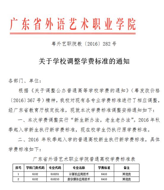 在校生的学费标准按照《关于学校调整学费标准的通知》(粤外艺职院教〔2016〕282号)规定执行。住宿费标准暂按照五山校区950元/生/学年,燕岭校区850元/生/学年,结算时学校根据广东省发展改革委的文件规定多退少补。医疗保险费每人314元,学生个人自主在学校的缴费平台缴交,学校统一划缴至广州市医疗保障局。