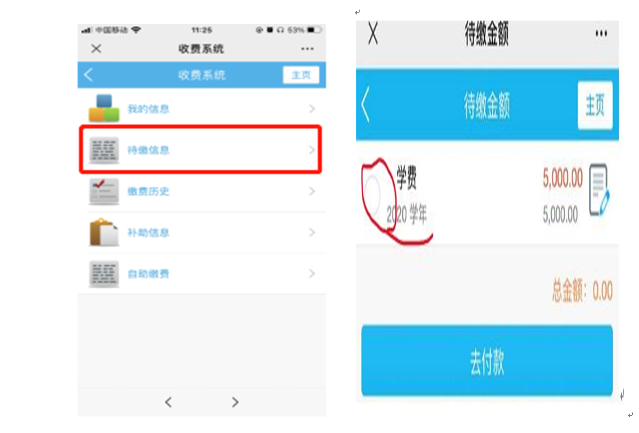 3.点击待缴信息,选择收费项目,点击去付款,完成微信支付。
