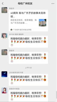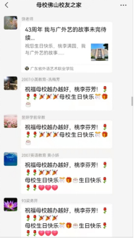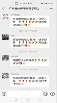 87级英语专业的吴小燕校友在墨西哥用中文和西班牙语祝福母校“光辉里程更辉煌,人才辈出代代强。桃李满天扬四海,硕果累累振中华。”85级英语专业的王婉毕校友在日本用中文和日语祝母校生日快乐,办得越来越好。80级英语专业方庆奇校友在南非、85级英语专业车彩燕校友在澳大利亚、97级英语专业林桂泉校友在加拿大用中文和英语向母校致以生日的祝福和未来办得越来越好的美好祝愿。广东省内各地区、海南、浙江等地的各专业校友代表以个人或集体的形式发来祝福视频。所有的祝福视频汇聚在一起通过学校的微信公众号发出,在各地校友中引起热烈反响,纷纷转发点赞。