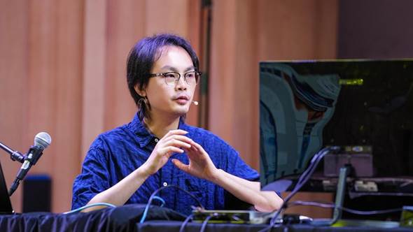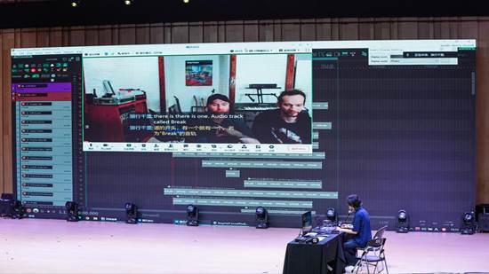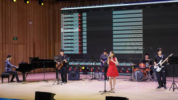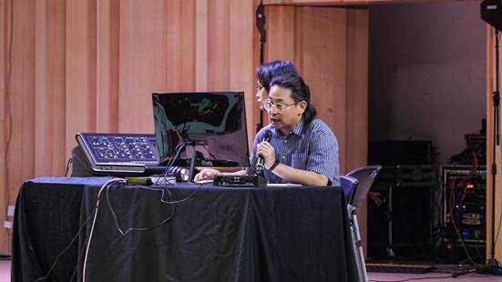 在工作坊环节,业内优秀专家Ambient Music创作人、吉他手张杰和造音星球媒介平台联合创始人、技术总监墨鱼(CuTTleFiSh),携手学校音乐舞蹈学院师生为我们带来一场别开生面的“流行乐队现场同期录音”演示,让大家近距离感受音乐与技术完美融合。