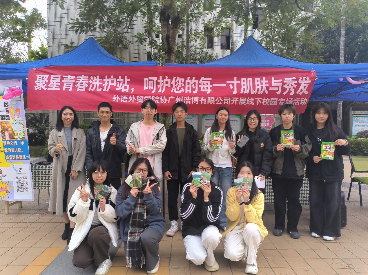 为促进校企合作,岗教融合、产教育人,让学生在实践 中学真知、悟成长,12月9日,外语外贸学院与广州浩博信息技术开发有限公司开展了首期校园专场实践活动,该项目与国内知名品牌索芙特合作,由跨境电子商务学生社团校企合作部承接,通过线上直播和线下推广,帮助企业双渠道开拓洗护用品市场。