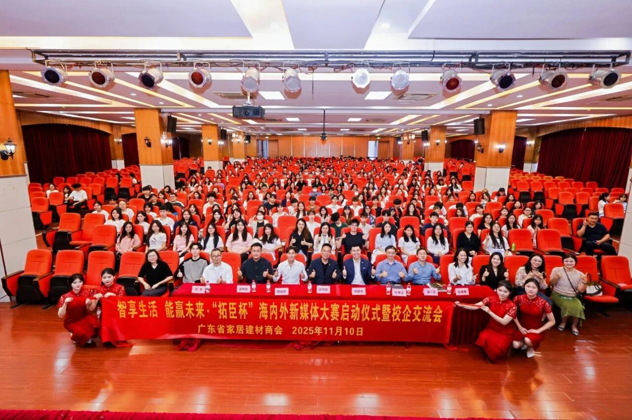近日,由学校外语外贸学院联合广东省家居建材商会主办、广东拓臣科技发展有限公司独家冠名的校企合作项目“拓臣杯”海内外新媒体大赛启动仪式暨校企交流活动在龙洞校区大礼堂举行。学校副校长袁洪、产教融合与实训管理、外语外贸学院相关负责人、广东省家居建材商会执行会长兼秘书长杨传辉、拓臣科技总经理郑壁奎、燎原玩家文化传媒有限公司(香港)总经理吴炯亮以及学院指导老师、商会会员企业代表和学生代表近600人共同参加大会。