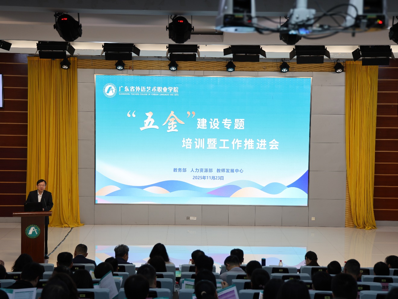 为深入贯彻落实新时代高质量教育发展要求,扎实推进“金专、金课、金教材、金师、金地”体系建设,11月23日,学校在五山校区行政楼9楼学术报告厅召开“五金”建设专题培训暨工作推进会。学校党委书记马栩生出席会议并讲话,副校长郝勇、袁洪、朴红梅、相关职能部门、教辅部门和教学单位负责人、专业带头人、教研室主任及教科研骨干等近两百人参会,会议同步面向全校直播。会议由袁洪主持。