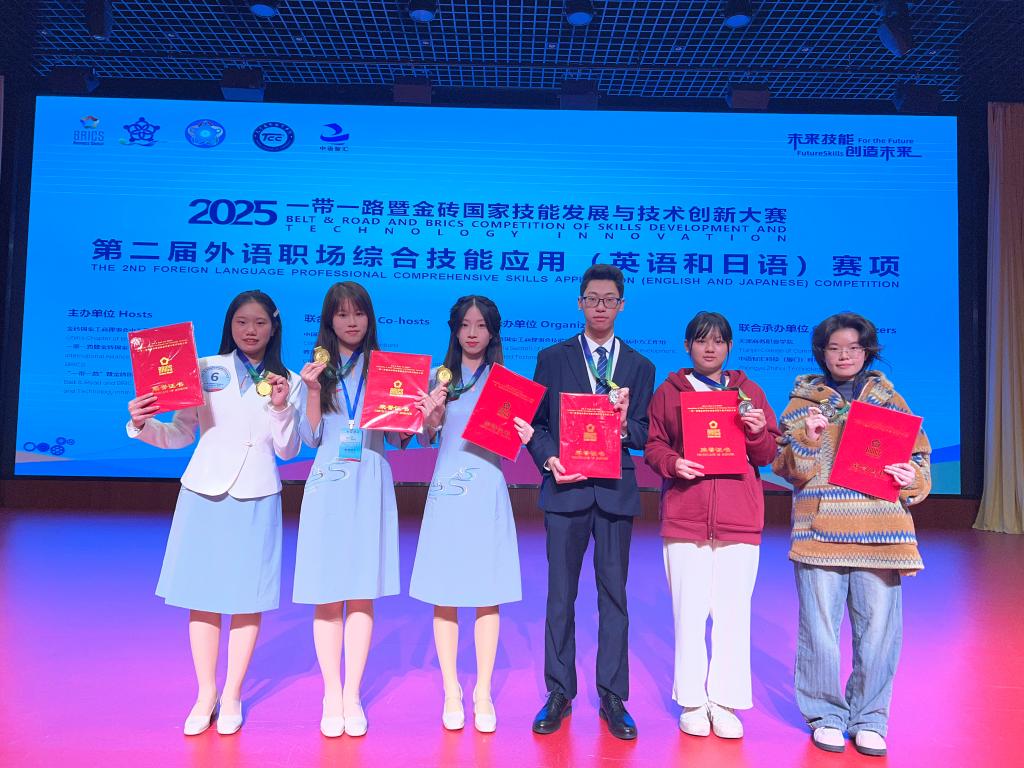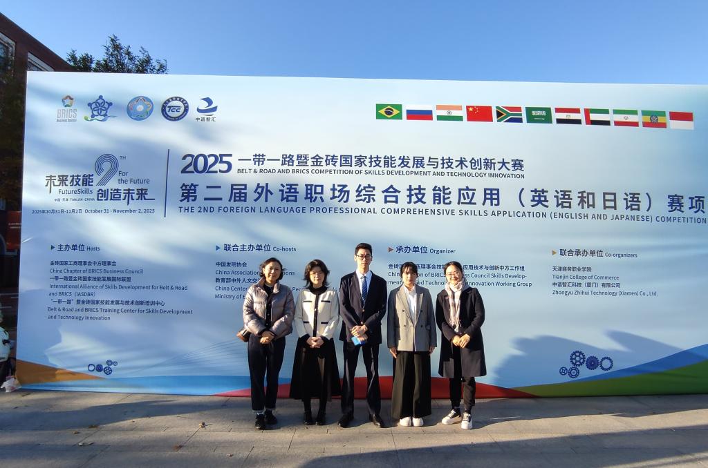 11月1日至2日,2025“一带一路”暨金砖国家技能发展与技术创新大赛外语职场综合技能应用(英语和日语)赛项全国决赛在天津商务职业学院成功举办。我校外语外贸学院两支参赛团队表现优异。由林超、詹作琼老师指导的朱少婷、刘淑敏、陈海燕团队勇夺英语赛项全国一等奖,吴思佳、蓝媚老师指导的何科广、韦敏婷、黄译可团队荣获日语赛项全国二等奖,充分展现了我校外语人才培养的扎实成效。