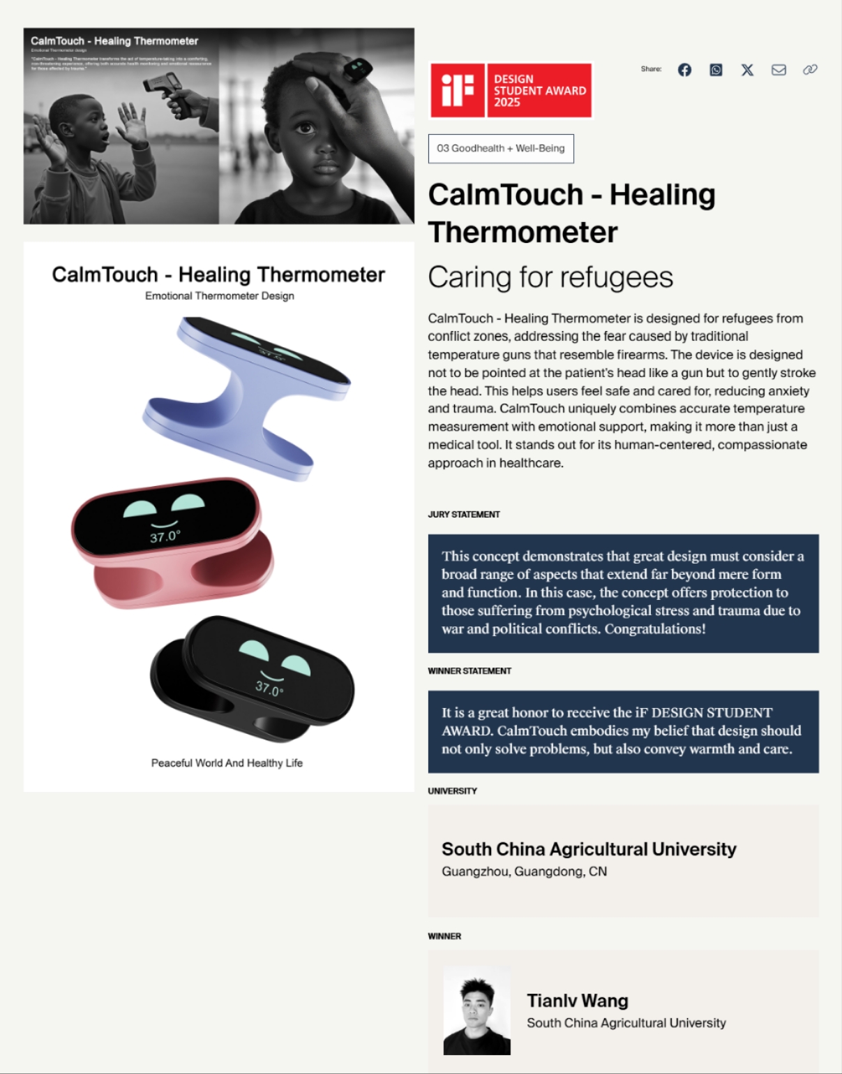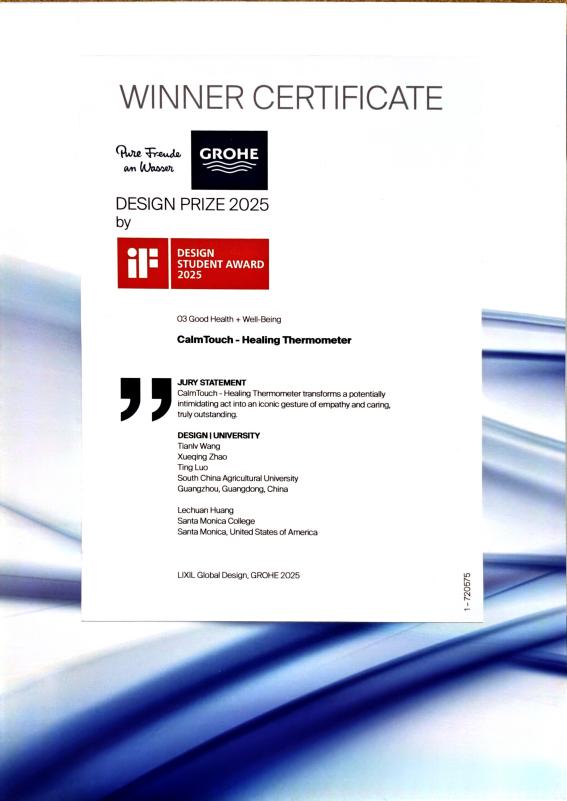 王天铝此次获奖作品为《CalmTouch-Healing Thermometer》,CalmTouch-疗愈温度计针对传统体温枪易引发难民恐惧和心理创伤的痛点,创新性地将测温方式转变为安抚性的抚触动作,在保障测温精准的同时,缓解用户情绪压力,带来安全与关爱的双重体验。