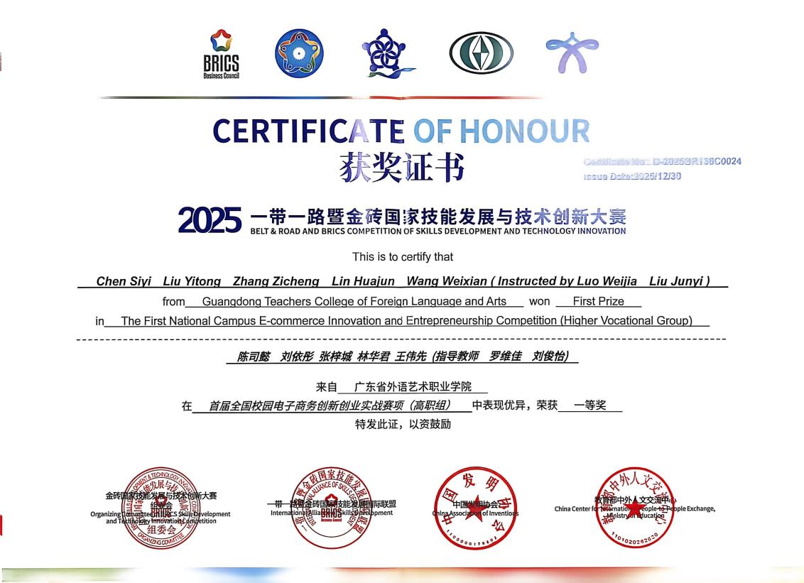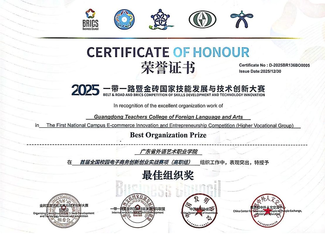 学院将以此次获奖为契机,进一步深化教育教学改革,推动创新创业教育与专业教育深度融合,持续培养更多兼具国际视野、创新精神与实操能力的高素质技术技能型电子商务人才,精准对接粤港澳大湾区建设与广东经济社会高质量发展的核心人才需求,为推动区域数字经济提质升级与商贸产业创新发展贡献坚实力量。