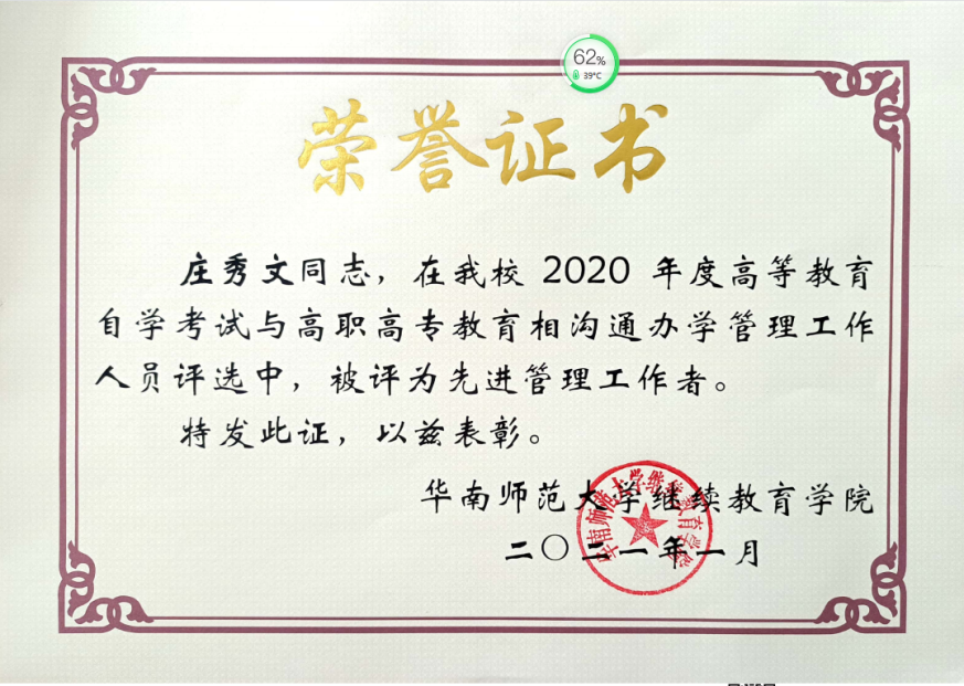 在华南师范大学自学考试相沟通(第二学历)2020年度教学点检查评估工作中,我校自考办学在华师76个教学点中脱颖而出,成为17个优秀教学点之一。在华师2020年度自考相沟通办学管理人选评选中,庄秀文同志被评为先进管理工作者。