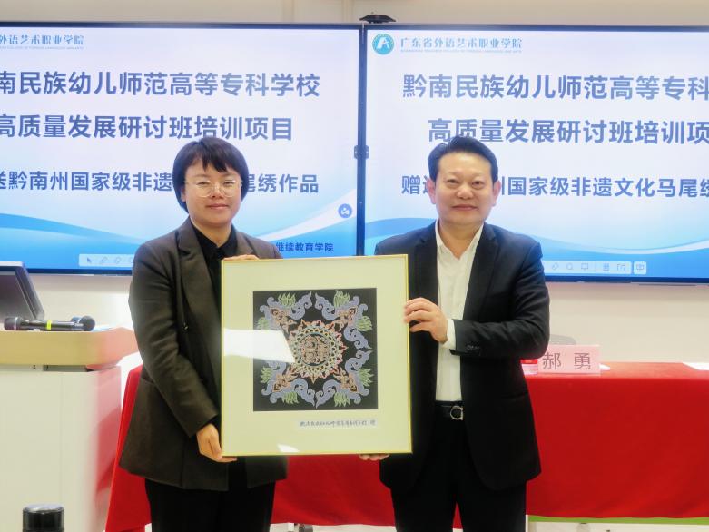随后,黔南民族幼专向学校赠送一幅黔南州国家级非遗文化马尾绣作品。