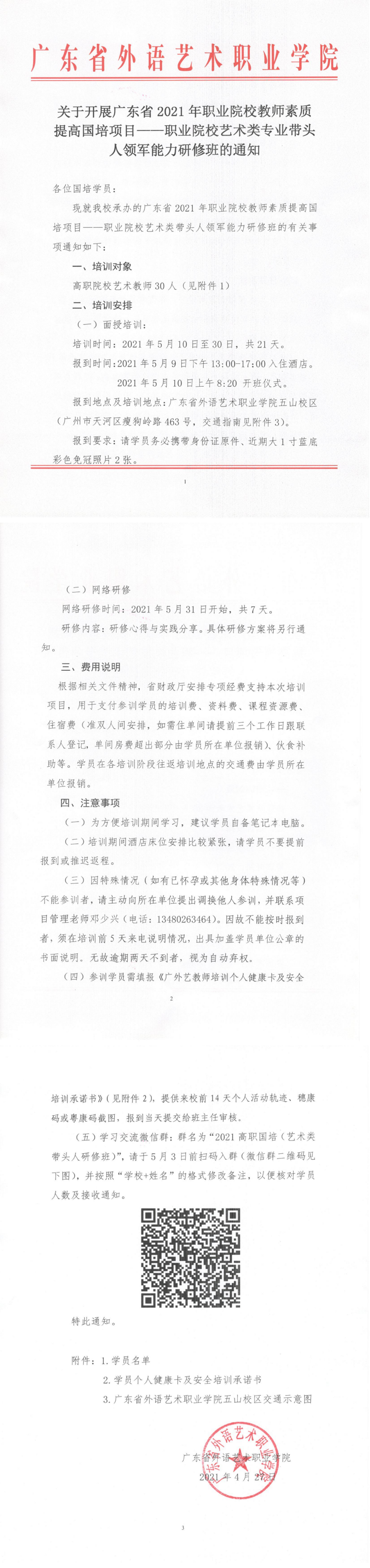 关于开展广东省2021年职业院校教师素质提高国培项目——职业院校艺术类专业带头人领军能力研修班的通知