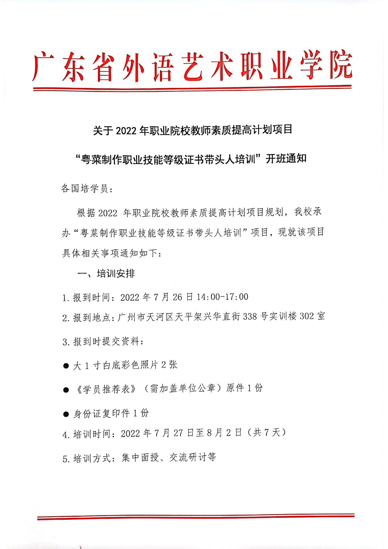 关于2022年职业院校教师素质提高计划项目 “粤菜制作职业技能等级证书带头人培训"开班通知