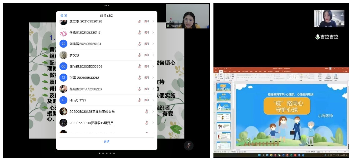 多方力量凝聚合力,共同研判守护健康。学校领导高度重视各校区疫情应急防控工作,关心学生的心理健康状况。学校分管心理工作的副书记黄泽瑜在开学前的学生信息研判暨心理工作会议上部署新学期心理健康工作;学校心理健康教育与咨询中心召开两次心理辅导站工作会议,讨论新学期学生心理工作的主要任务、研讨重点学生个案;各学院内部相继召开学生心理研判会议。学校上下多头并进、齐心协力促进学生心理健康教育工作。