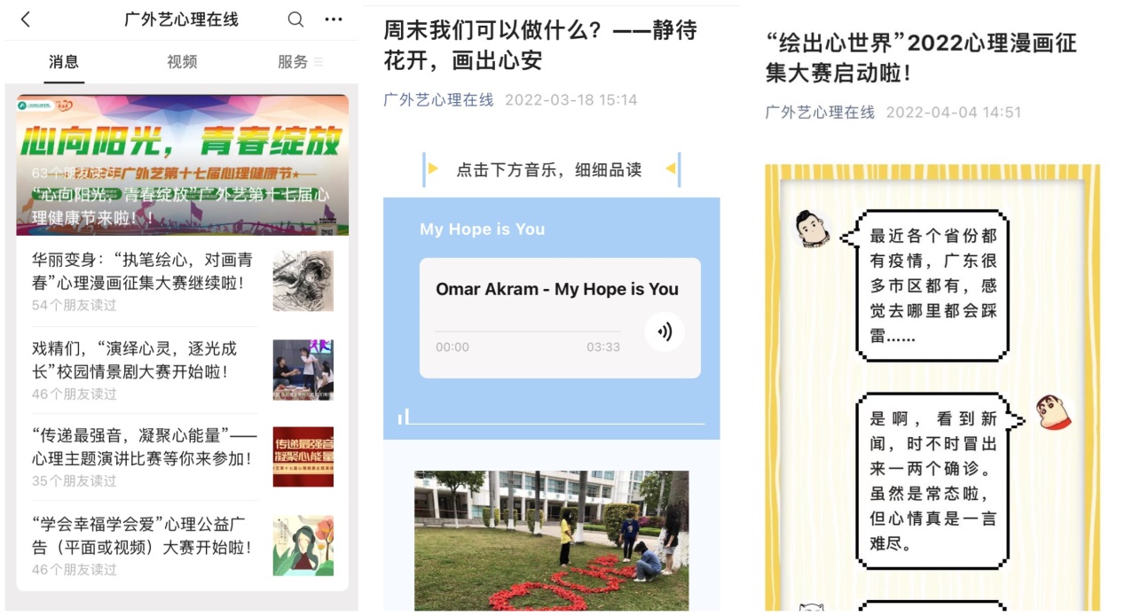 全面加强宣传教育,建立心理防疫屏障。把心理防疫渗透到心理健康教育课开展广泛知识宣传教育;全校383个班级一万多名学生开展《心理防疫锦囊》主题班会课,班会课由各班德育导师/班主任主持;各个学院开展班主任专题培训、心理干部专题培训,全方位开展心理防疫知识宣传教育,引导学生坚定、自信地面对疫情。学校官微,校园网、广外艺心理在线微信公众号等新媒体平台,每日更新发布疫情防控通知、心理疏导工作指引、学生心理自助指南、学生心理调适小技巧等,帮助学生正确的认识疫情,了解自我心理保健知识,接纳与应对自身关于疫情引发的各种负面情绪和压力。