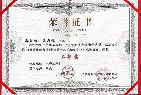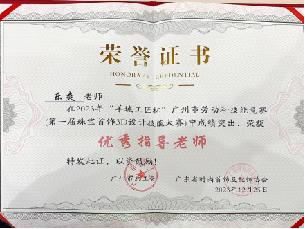 12月25日,我校艺术设计学院首饰设计与工艺专业学生张芷欣、马逸飞在2023年“羊城工匠杯”广州市劳动和技能竞赛(第一届珠宝首饰3D设计技能大赛)中荣获二等奖,指导老师乐爽被评为优秀指导老师。