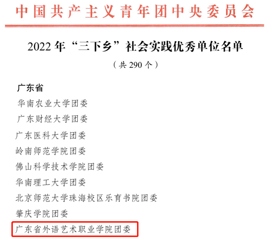 近日,共青团中央发布《关于2022年全国大中专学生暑期社会志愿者暑期文化科技卫生“三下乡”社会实践活动的通报》,我校荣获2022年全国“三下乡”社会实践优秀单位,成为全国290个获此殊荣的单位之一。